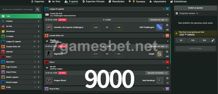 O 9000 oferece uma grande seleção de opções de apostas em e-sports com probabilidades competitivas